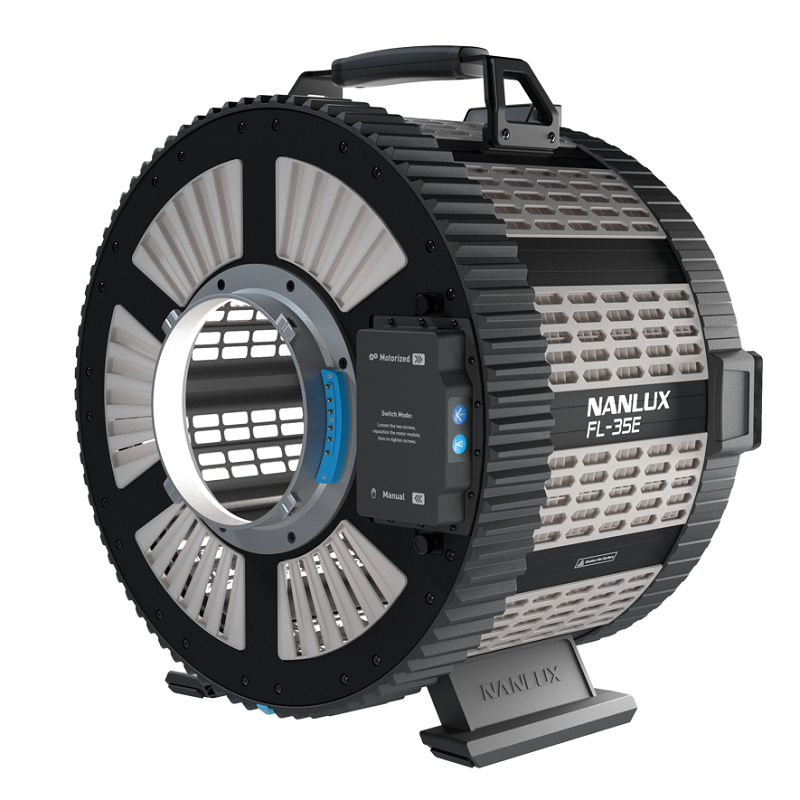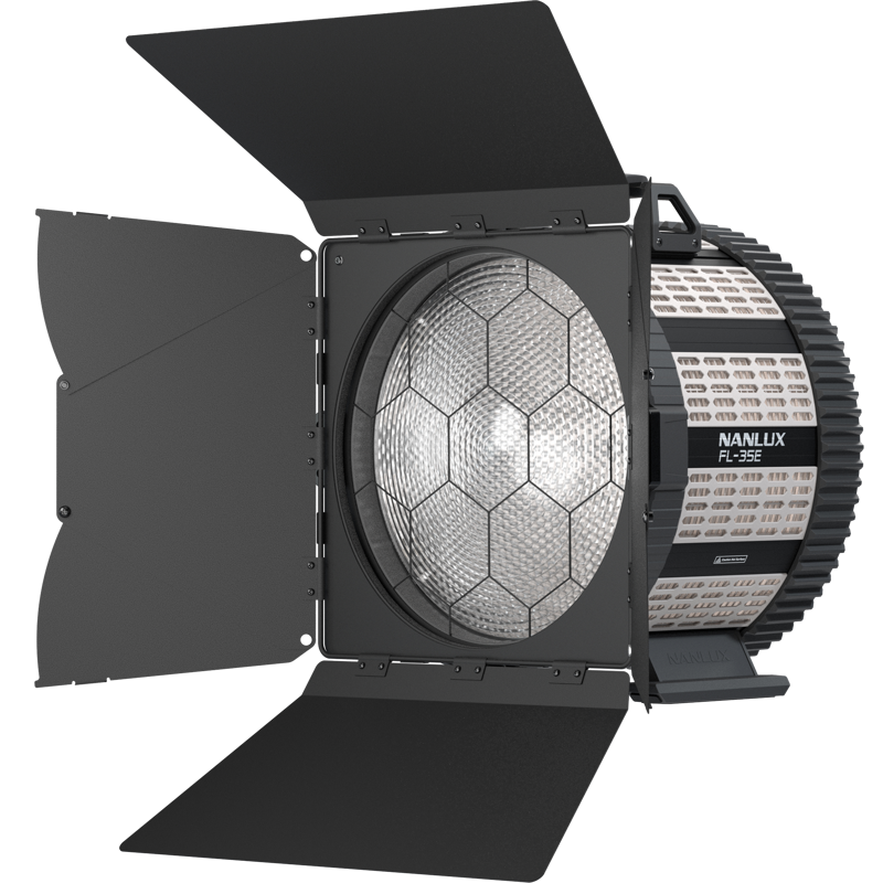Includes: 2-wheel rolling case, Nanlux FL-35E motorized Fresnel lens w/ barndoors