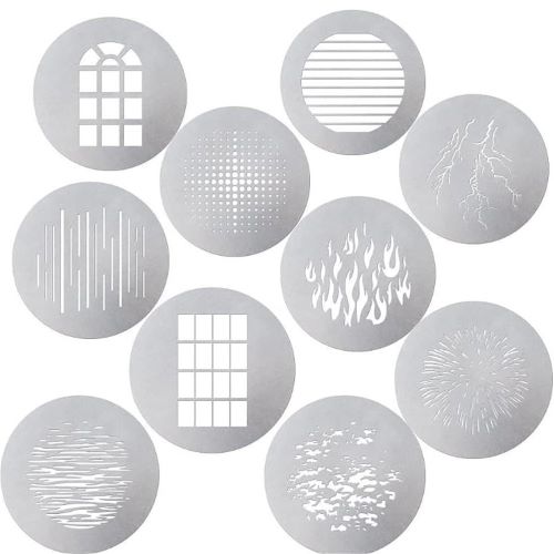 Includes: carrying case, spotlight mount, 19° lens, iris, gel frame, gobo holder, 12x gobos